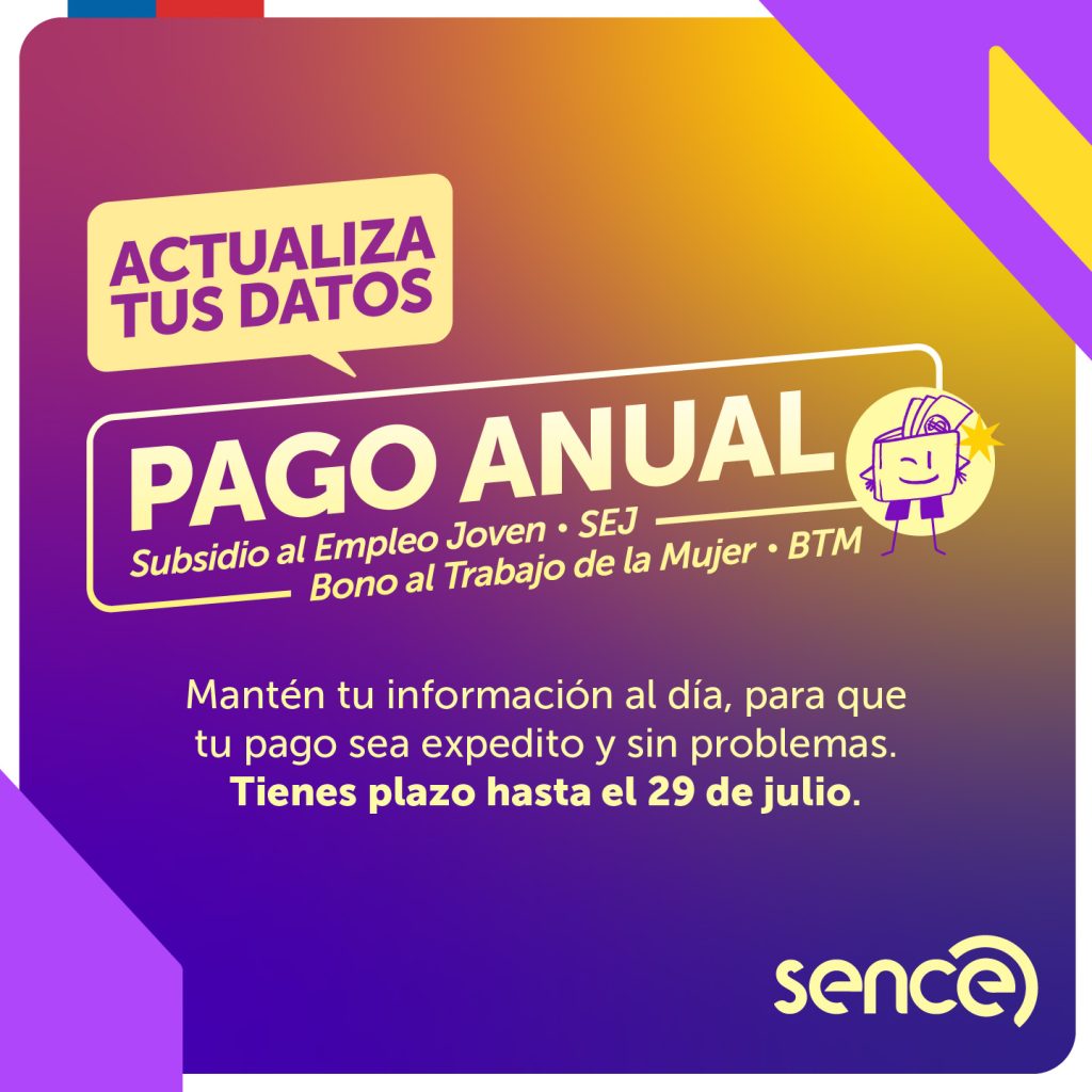 Hasta el próximo lunes 29 de julio se extenderá el plazo para que las personas beneficiarias de los subsidios al Empleo Joven -SEJ- y bono al Trabajo Mujer -BTM- que hayan optado por la modalidad de pago anual, actualicen sus datos bancarios y reciban de forma adecuada y oportuna el pago de este beneficio correspondiente al año 2023.
