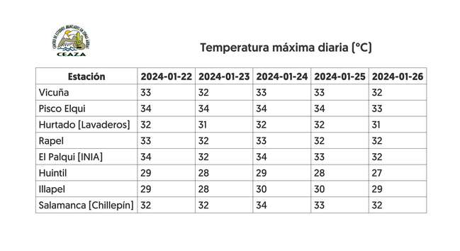 Tomás Caballero, meteorólogo del CEAZA, indica que “las temperaturas máximas alcanzarían valores por sobre lo normal para la época. Por ejemplo, en Vicuña se pronostican 33° C, mientras que en Pisco Elqui, El Palqui y Salamanca se registrarían hasta  34°C”.